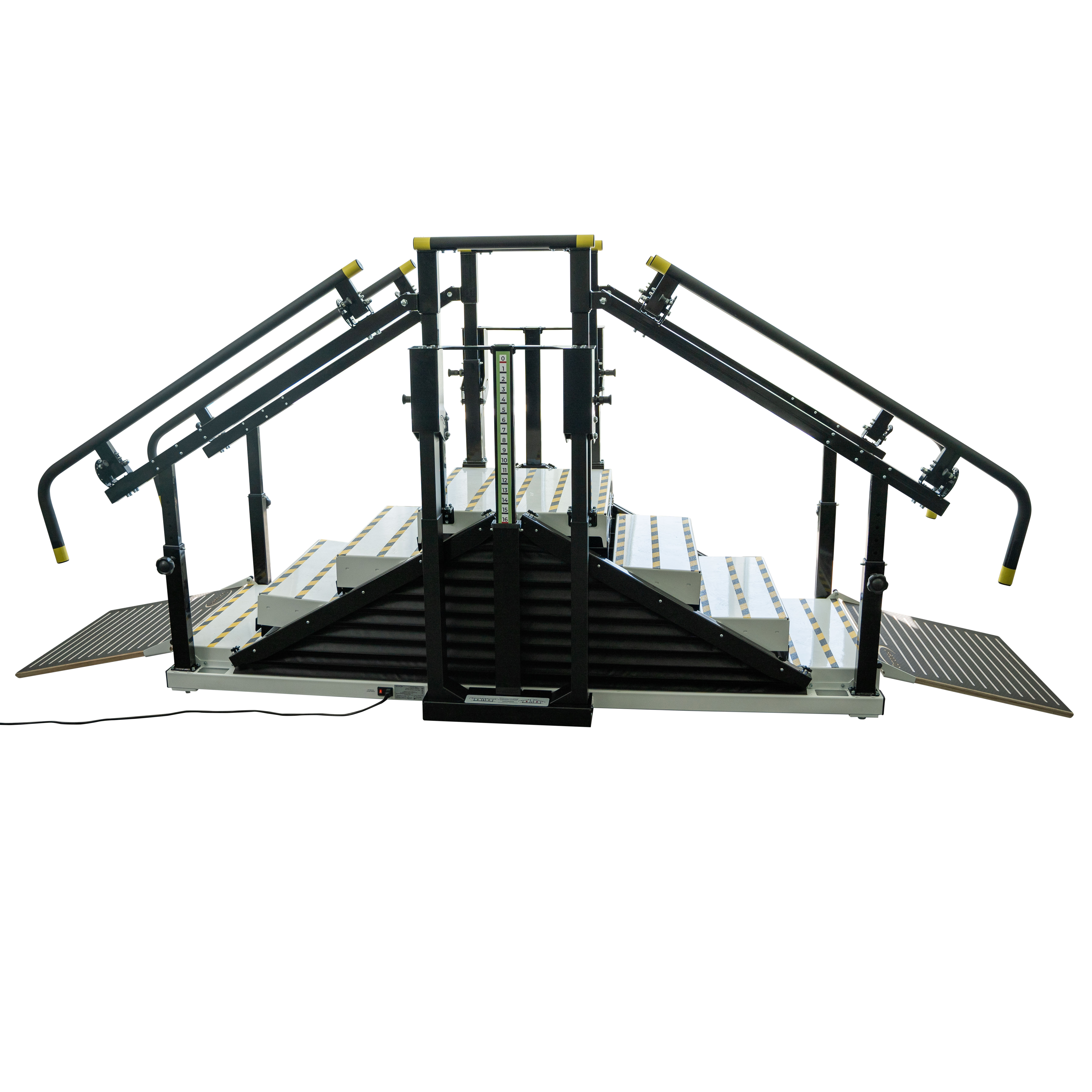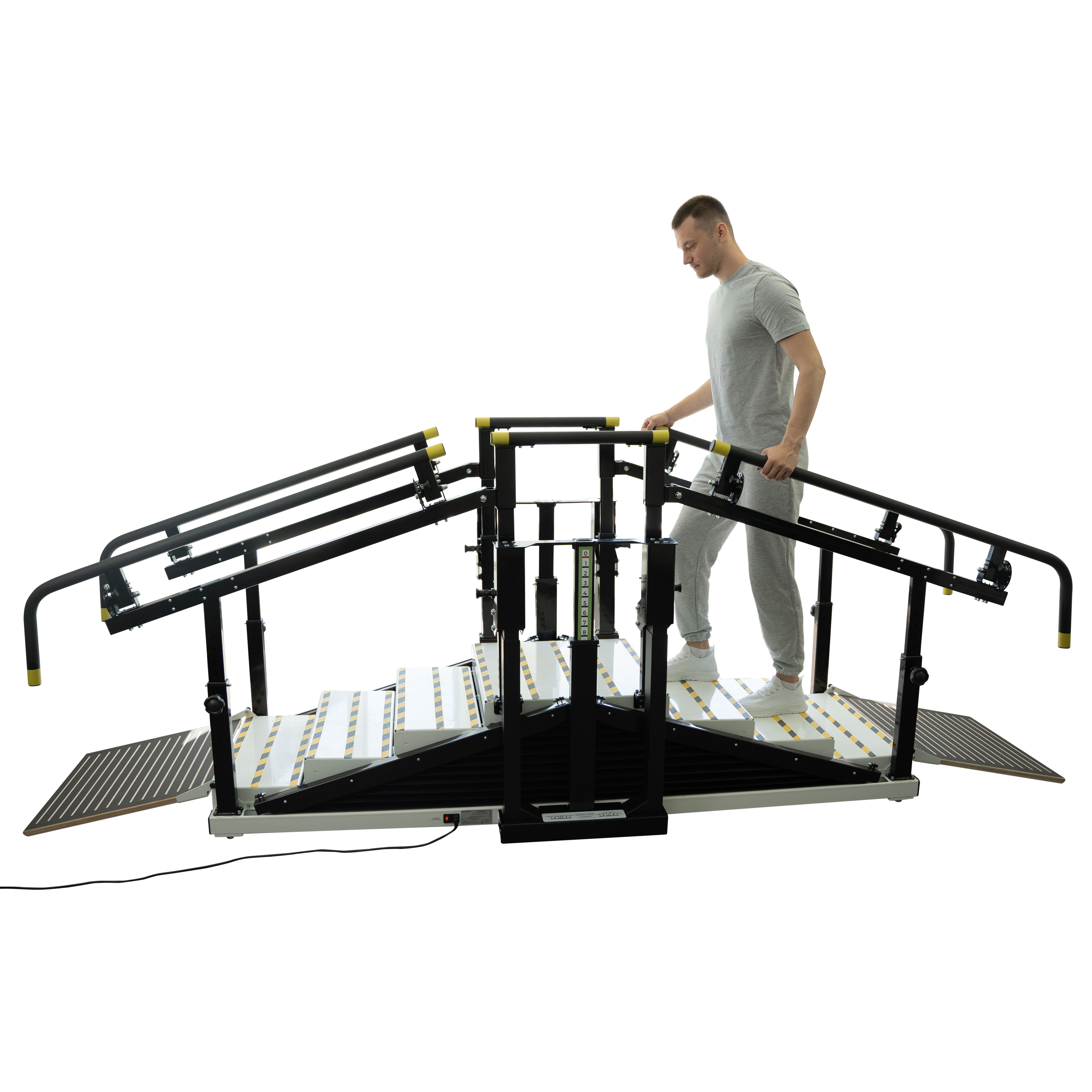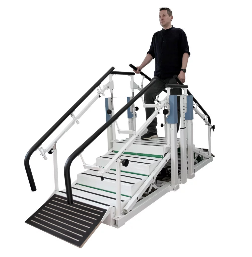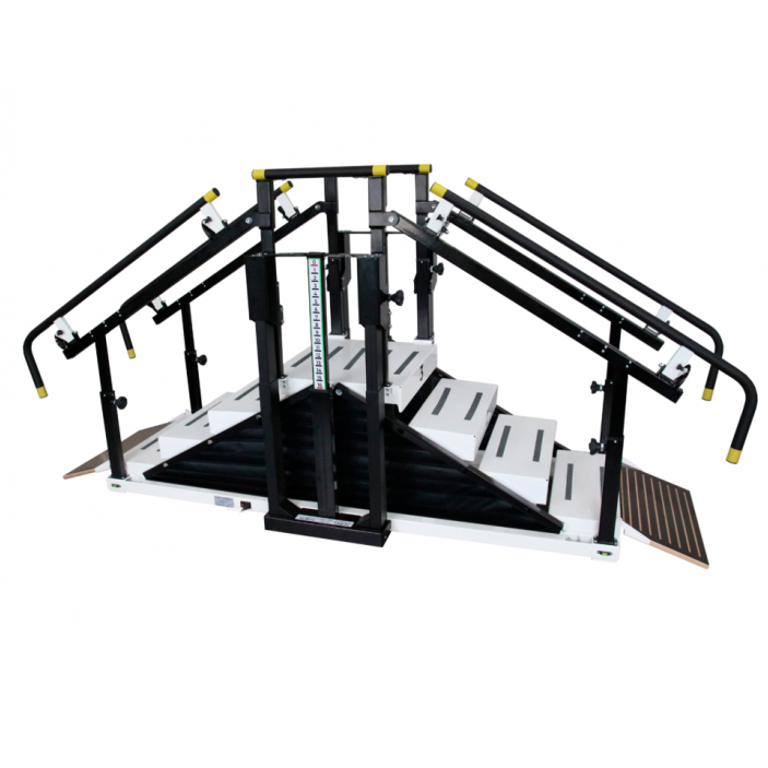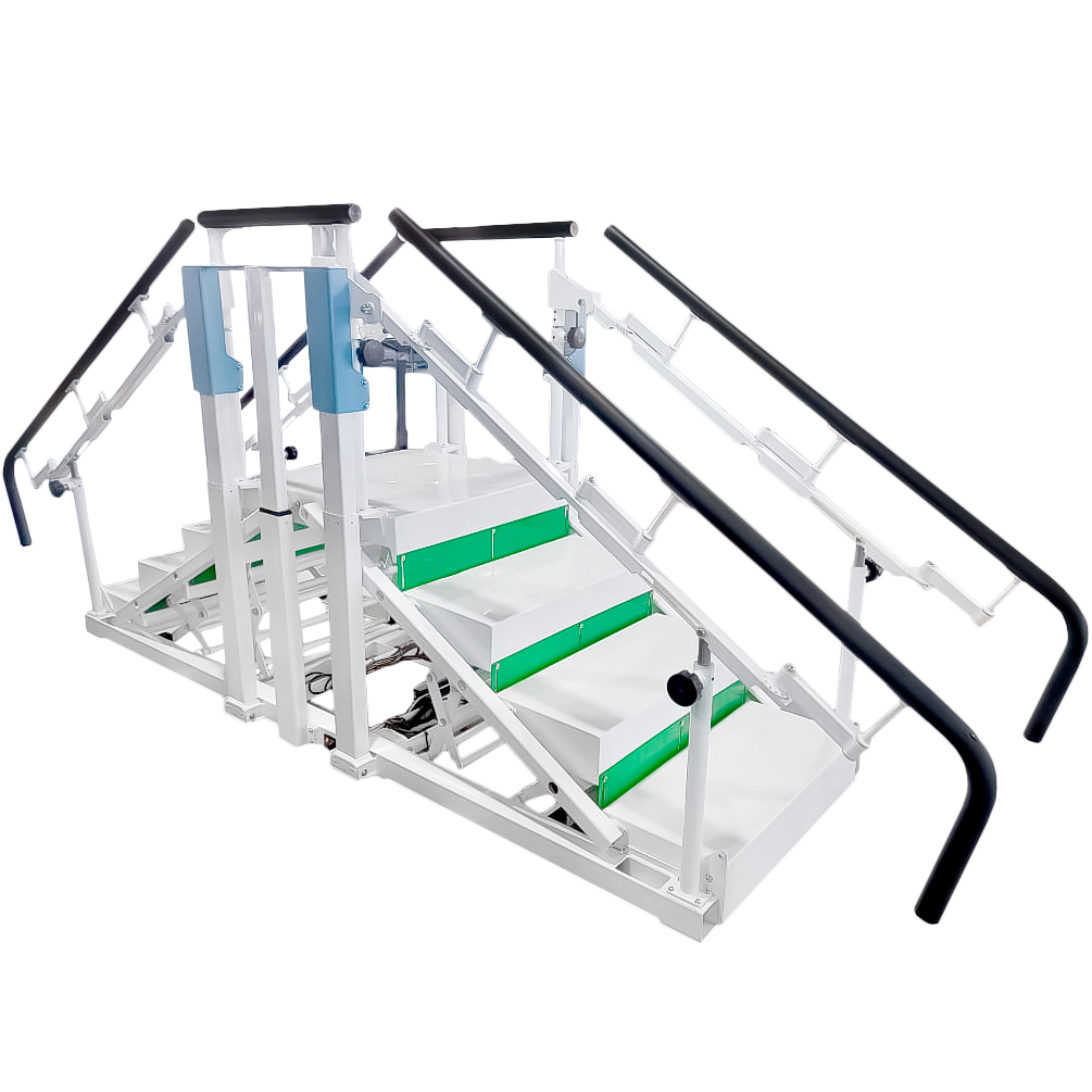 Лестница легко адаптируется к индивидуальным особенностям каждого пациента. Брусья-поручни настраиваются по высоте и ширине, а ступени регулируются с помощью подъёмных колонн и пульта управления, работающего от электропитания. Это позволяет поднимать ступени на ту высоту, которую пациент сможет преодолеть, что особенно важно при дефиците мышечной силы и отсутствии двигательного паттерна. Тренажер также может использоваться в плоском положении как параллельные брусья, традиционно применяемые в медицинской реабилитации.