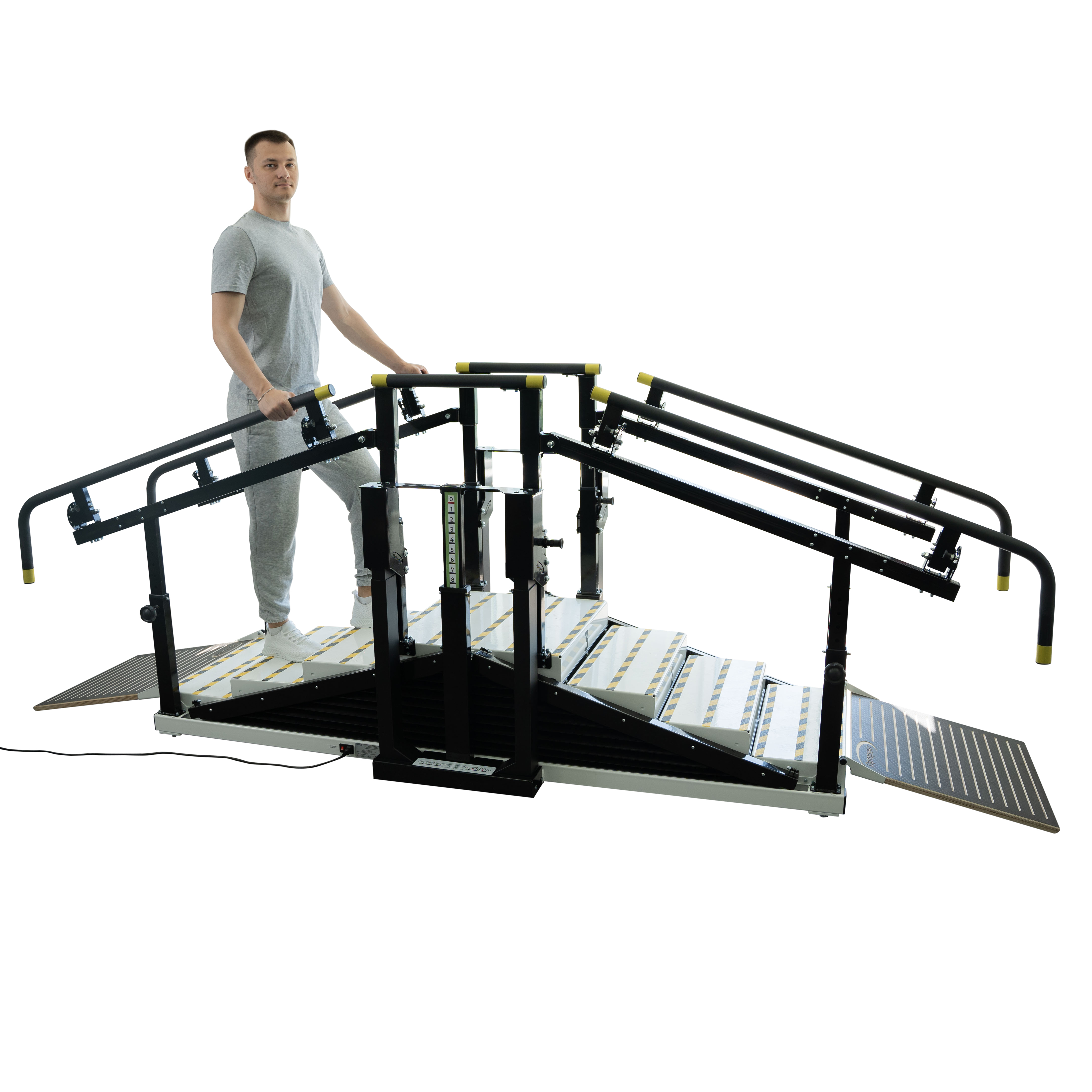 Лестница легко адаптируется к индивидуальным особенностям каждого пациента. Брусья-поручни настраиваются по высоте и ширине, а ступени регулируются с помощью подъёмных колонн и пульта управления, работающего от электропитания. Это позволяет поднимать ступени на ту высоту, которую пациент сможет преодолеть, что особенно важно при дефиците мышечной силы и отсутствии двигательного паттерна. Тренажер также может использоваться в плоском положении как параллельные брусья, традиционно применяемые в медицинской реабилитации.