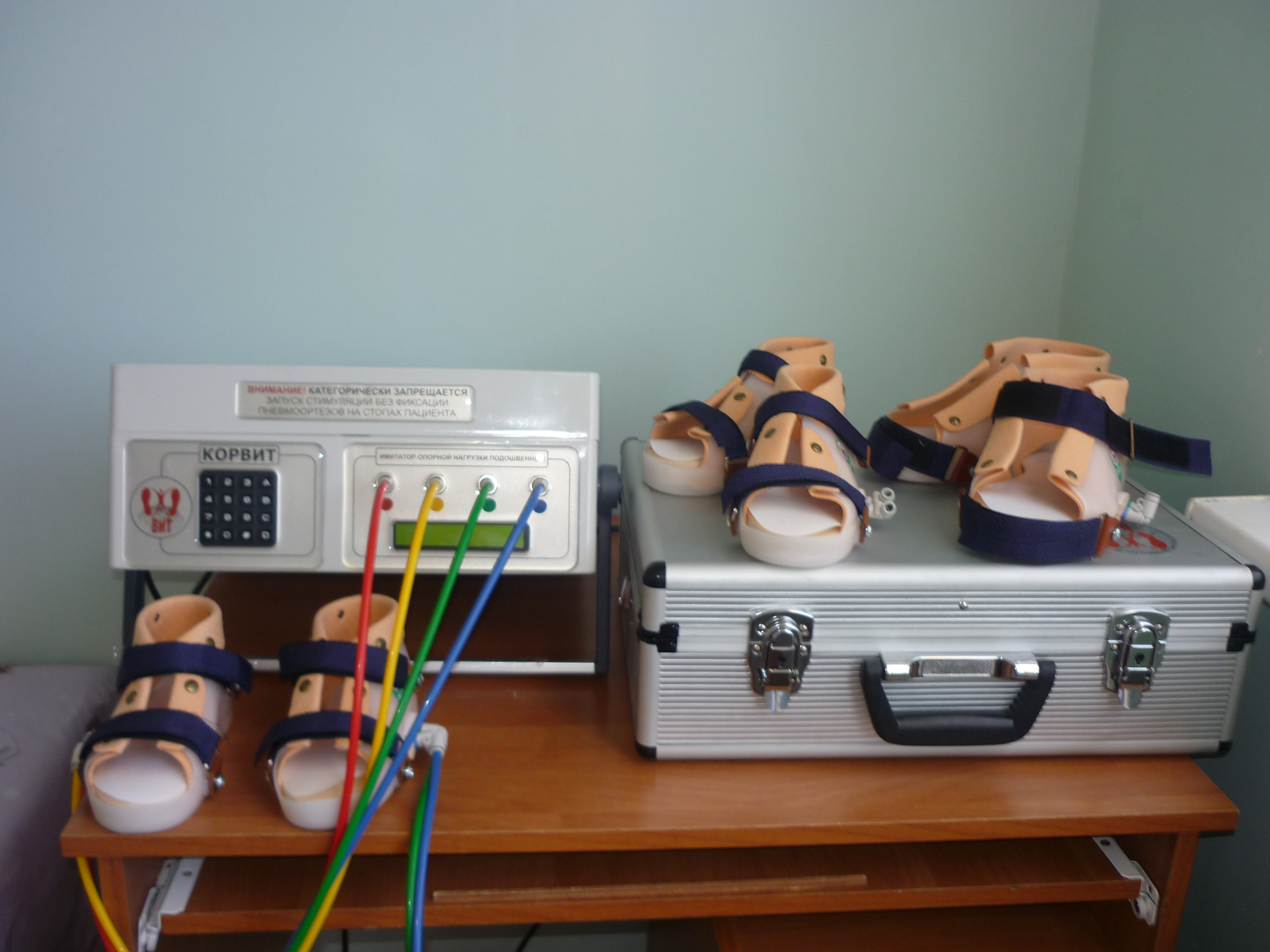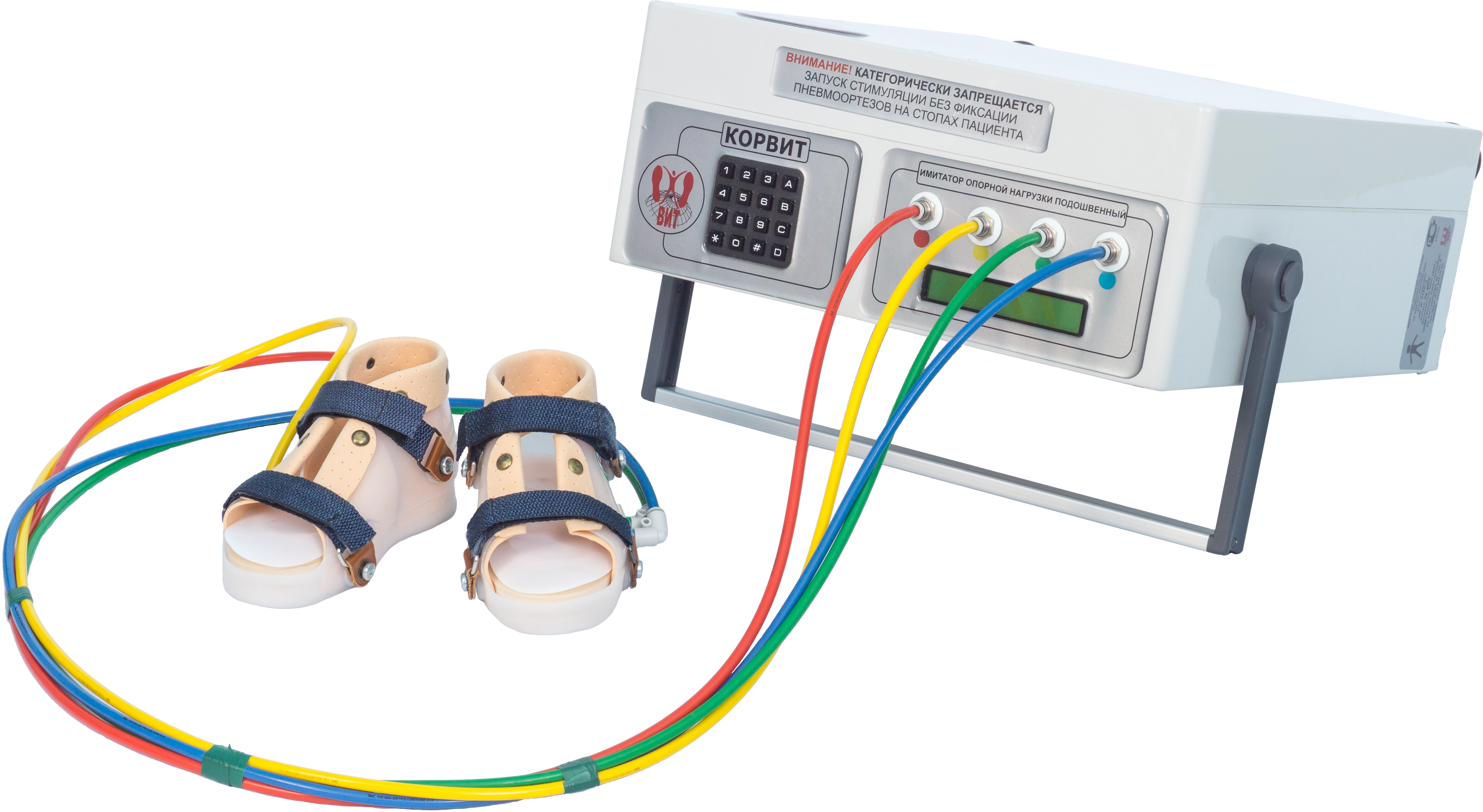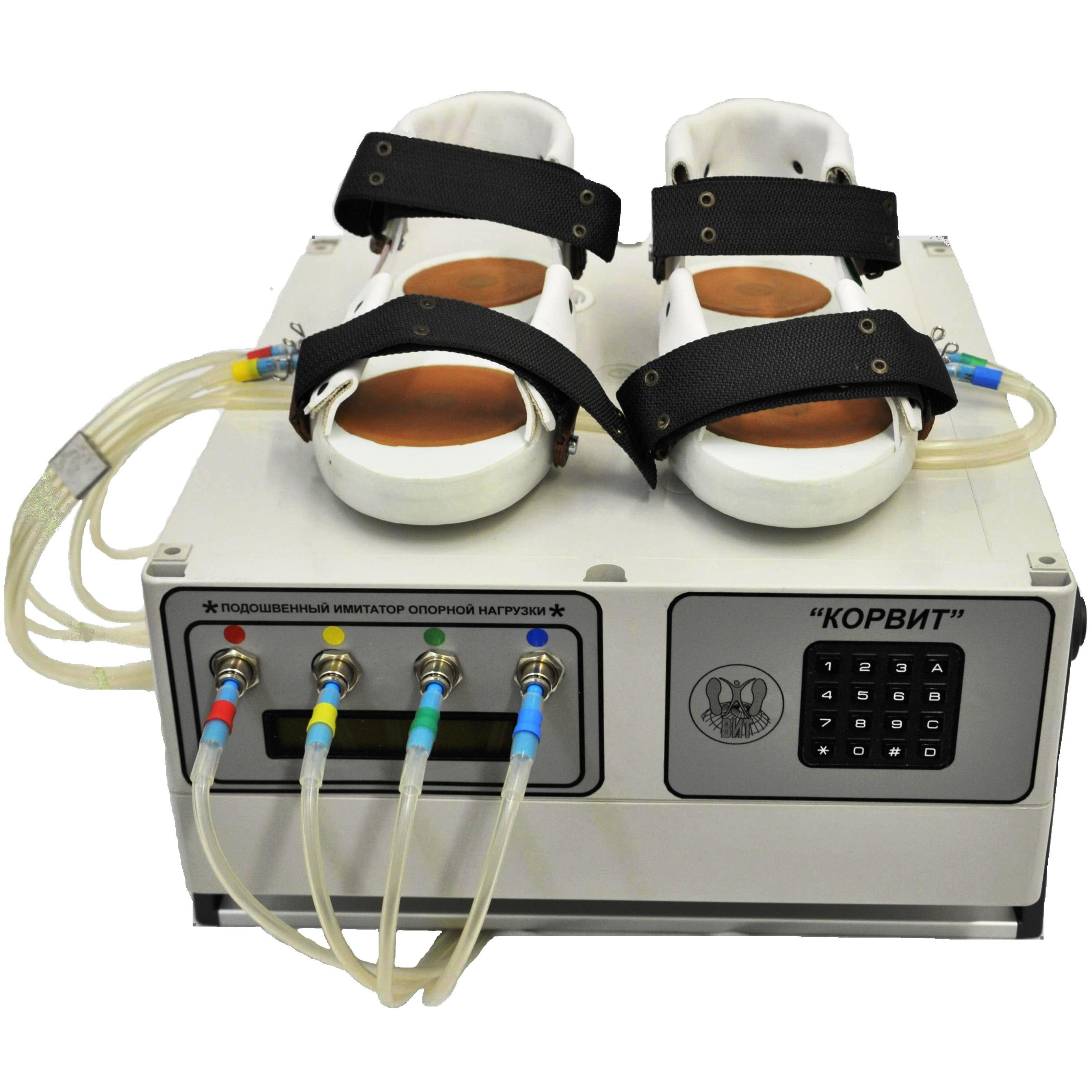 Имитатор ходьбы «КОРВИТ» предназначен для моделирования опорных реакций с использованием принципа пневмомеханического давления на соответствующие опорные зоны стопы с помощью специальных пневмокамер, обеспечивающих давление в импульсном режиме (режим реальной ходьбы). Действующим фактором имитатора опорной нагрузки подошвенного является механическая стимуляция пяточных и плюсневых зон стоп.