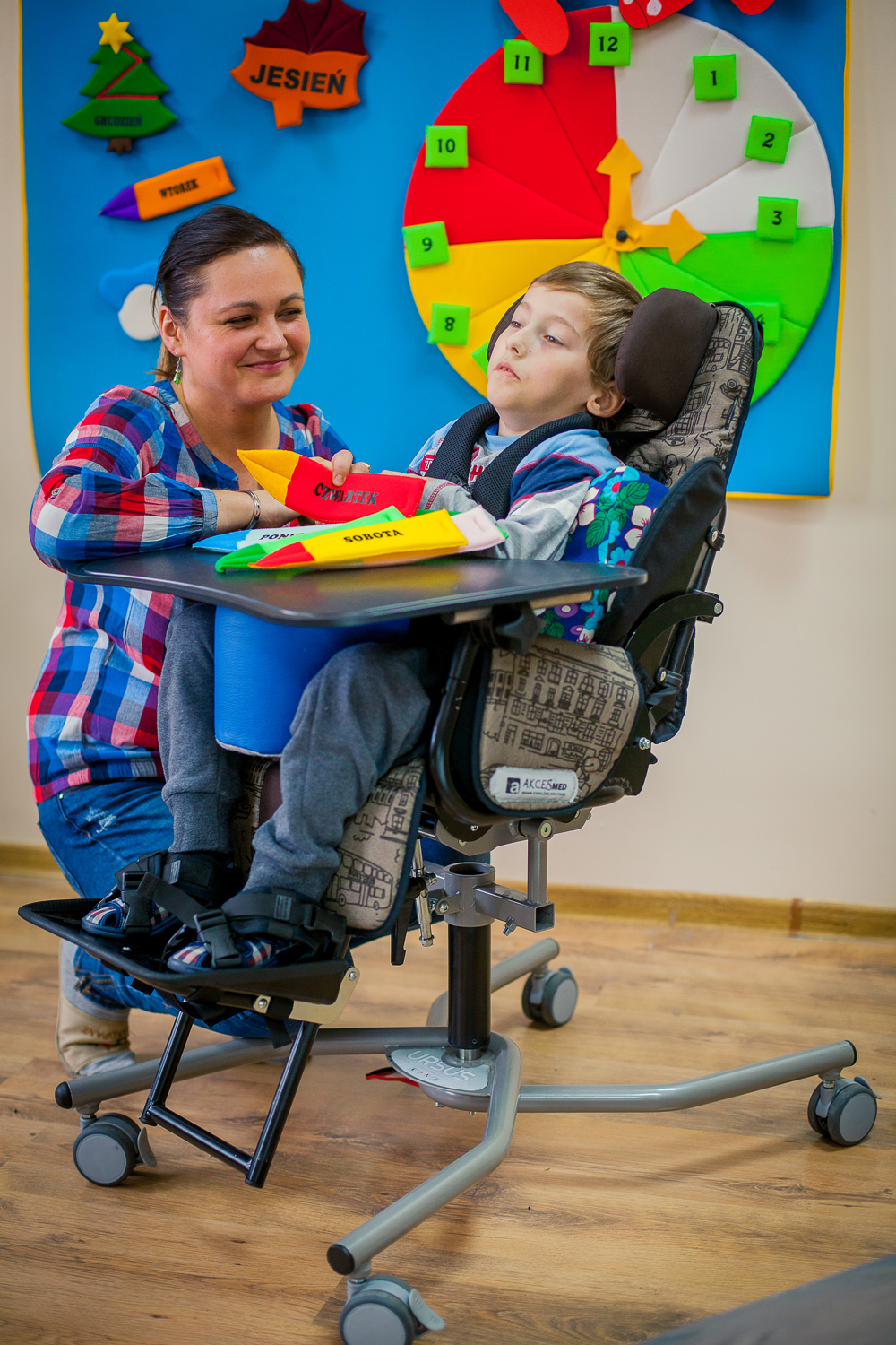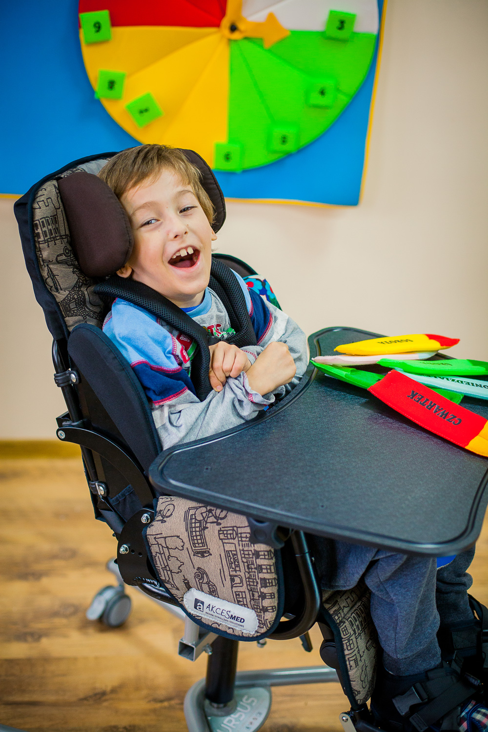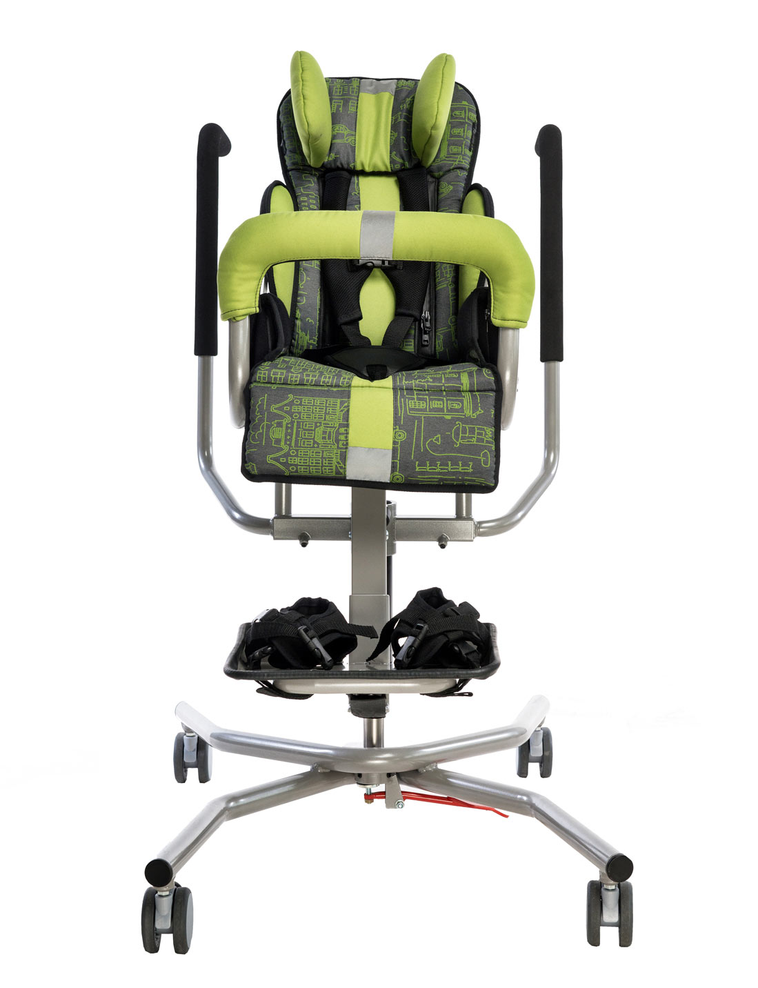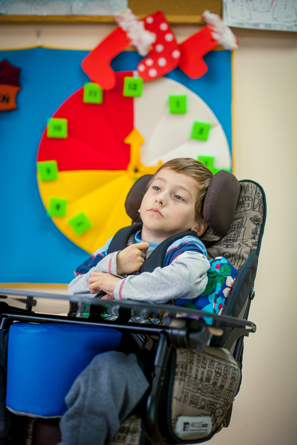 Стабильная конструкция комнатной коляски Урсус Хоум, расширенная система пелот и ремней безопасности стабилизируют позу ребенка и обеспечивают его безопасность во время использования. Кресло-коляска оснащена также барьером, который защищает пациента от выпадения.