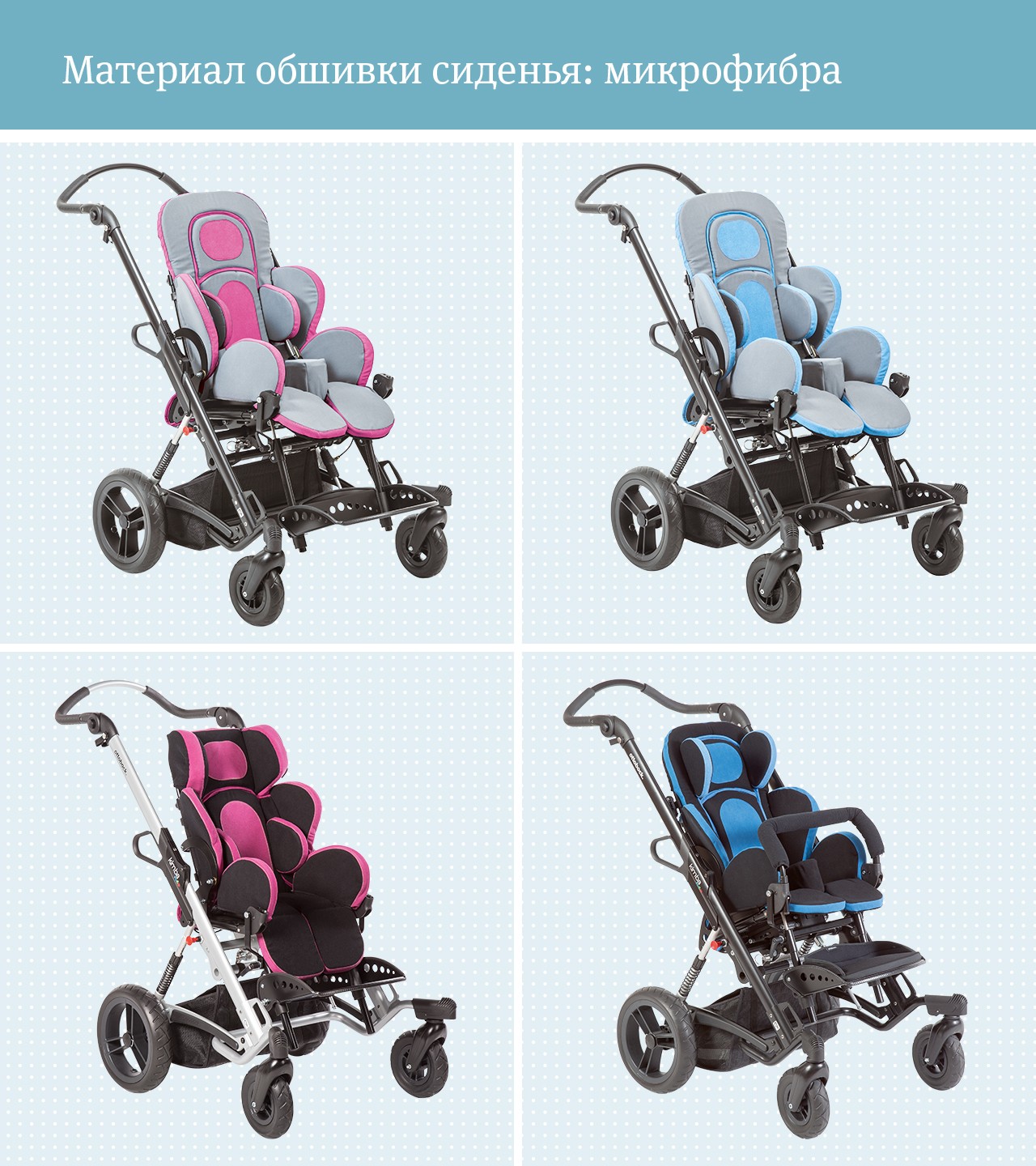 • Обивка кресла Кимба Нео мягкая на ощупь и не скользит, ребенку будет комфортно находиться в ней длительное время. Для обивки коляски используется специальная прочная, сверхмягкая ткань, за которой легко ухаживать.